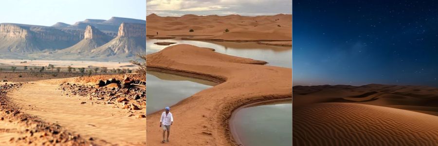 ¡Empieza el Rock and Roll! Tras desayunar y recoger el campamento nos dispondremos a ajustar las presiones de los neumáticos para adaptarlas al rodaje por pista, amarraremos todo el equipo al 4×4 para no tener ningún percance y pondremos rumbo Este para alcanzar el Lago Iriki. Realizaremos un alto en el camino en el bar-restaurante El Titanic y podremos contemplar la extensa planicie donde encontraremos el famoso té moruno para, seguidamente, continuar con nuestro Track rumbo Este hasta llegar a M-Hammid y buscar una buena zona en la que montar nuestro campamento en mitad del desierto y cotemplar el maravilloso espectáculo que supone observar las estrellas en medio del desierto.