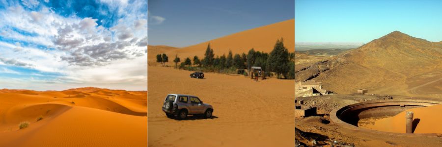 Hoy dedicaremos el día a rodear el Erg Chebbi siguiendo el río de arena y practicando conducción sobre dunas. Realizaremos un curso práctico de conducción en arena, visitaremos el Oasis de Oubira, las antiguas minas francesas y la avenida comercial de Merzouga, donde podremos hacer algunas compras. Por la tarde regresaremos al Hotel Riad Dar Hassan para cenar y descansar. Los vehículos quedarán revisados y con las presiones de neumáticos adecuadas para el día siguiente.